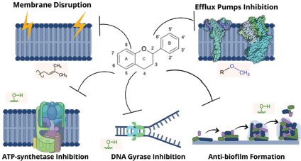 Mechanisms provided in the present review may assist in the optimization and understanding of a lead compound’s activity, provide a focus for toxicological attention, and aid in the anticipation of bacterial resistance. Given the current situation concerning antimicrobial properties and the escalating challenge of pathogen resistance mechanisms, flavonoids represent a promising avenue for further research and potential therapeutic applications. In conclusion, flavonoid compounds present an expansive and relatively unexplored reservoir of therapeutic agents, necessitating further studies to comprehensively elucidate the underlying mechanisms and realize their full in vivo antibacterial potential.