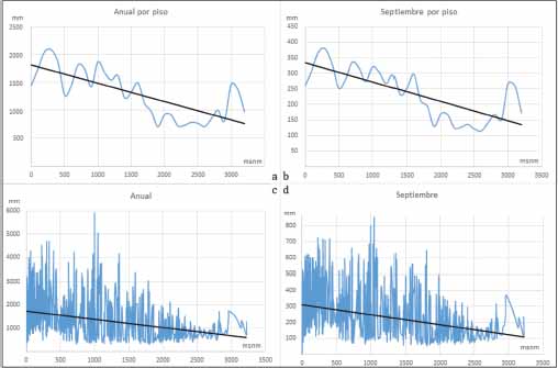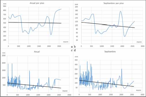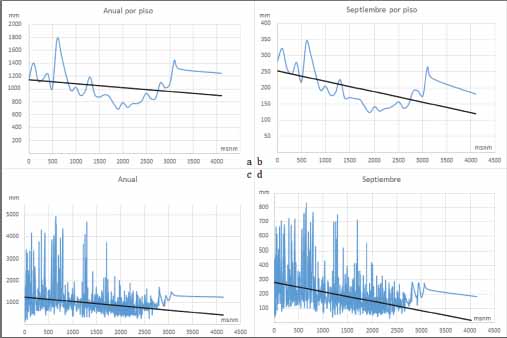 Esa progresión o aumento de la precipitación con la altura, que experimenta la zona extratropical de la vertiente del Océano Pacífico, también se aprecia en el mes más lluvioso del año, septiembre (Gráfica 1b y 1d), el cual presenta cinco picos óptimos, tres de los cuales superan los 250 mm, como en el caso de: los 650, 1875 y 2570 msnm, con 301, 252 y 312 mm respectivamente. Donde, geoestadísticamente, su línea de tendencia sugiere que, por cada 100 m de ascenso, en septiembre, el gradiente pluviométrico gana 11.5 mm de lluvia, en tanto que anualmente la ganancia es de 81.7 mm por 100 de altitud.