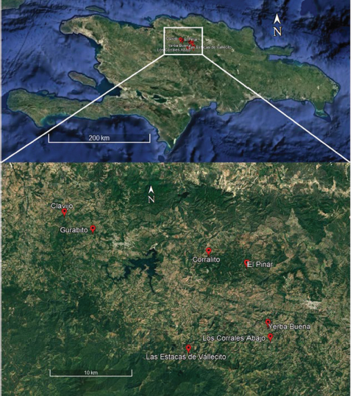 Durante el año 2022, se realizaron visitas de reconocimiento para identificar focos de ataques de I. calligraphus, tanto en bosques naturales como en plantaciones de P. occidentalis. En total, se seleccionaron nueve puntos distribuidos en seis lugares (Figura 1): Yerba Buena (1 punto), Clavijo (3 puntos), Los Corrales (1 punto), Gurabo (1 punto), La Estaca de Vallecito (1 punto) y La Celestina (2 puntos). En cada uno de estos puntos, se seleccionaron aleatoriamente individuos afectados en fase II (fase de colonización masiva) por I. calligraphus con un diámetro a la altura del pecho (DAP 1.3 m) igual o superior a 25 cm. A la altura del DAP del árbol se removió la corteza y con una pinza estéril se extrajeron los individuos adultos del escarabajo, que posteriormente fueron colocados en una placa Petri estéril.