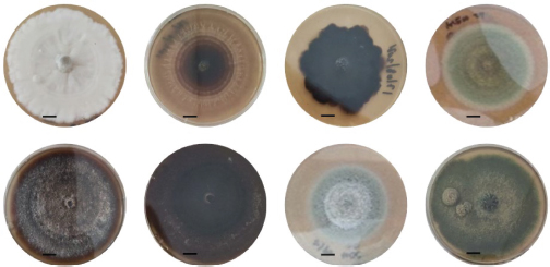 Los morfotipos puros obtenidos se cultivaron en un medio de cultivo de agar con extracto de malta (MEA) libre de antibiótico y se colocaron en la oscuridad a 25 ± 2 °C. Se evaluaron características como el diámetro y color de las colonias, el tipo de micelio, la arquitectura de las estructuras reproductivas, así como la forma de los conidios y ascosporas. Se recolectaron muestras de los cultivos a los ocho días, se montaron en portaobjetos con lactofenol y se observaron en un microscopio Motic Phantera C2. Para la identificación, se consultaron las claves taxonómicas de Barnett y Hunter (1998)) a nivel de género, y para especie, las de Upadhyay (1981)) y Jacobs y Wingfield (2001)).