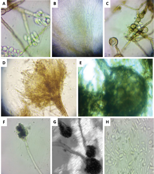 Estructuras morfológicas características de los hongos ophiostomatoides aislados de Ips calligraphus. A- Hyalorhinocladiella-con morfo asexual y conidios. B.- Ápice del cuello con hifas ostiolares ramificadas y ascosporas. C.- Clamidosporas. D.- Conidióforos sinematodos. E, F y G.- Peritecios de cuello largo en los ascocarpos con hifas. H.- Ascosporas alantoides
