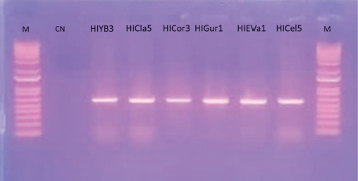 Gel de agarosa que muestra la amplificación de ADN de hongos con los cebadores ITS e I. M.-Representa el marcador molecular de 800 pb. CN.- Representa el Control Negativo. HIYB3.- Amplificación para ADN del morfotipo 3 proveniente de Yerba Buena. HICla5.- Amplificación para ADN del morfotipo 5 proveniente de Clavijo. HICor3.-Amplificación para ADN del morfotipo 3 proveniente de Los Corrales. HIGur1.- Amplificación para ADN del morfotipo 1 proveniente Gurabo. HIEVa1.- Amplificación para ADN del morfotipo 1 proveniente Estancia de Vallecito y HICel5.- Amplificación para ADN del morfotipo 5 proveniente de La Celestina