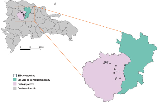 The study was conducted in the municipality of San José de las Matas (SAJOMA), located in the Santiago province of the Dominican Republic (Figure 1). This region is situated in the northwestern slope of Cordillera Central, within the coordinates of approximately 19.1833 N latitude and 70.9667 W longitude. San José de las Matas encompasses an area characterized by its diverse topography, which includes mountainous regions, rolling hills, and valley floors.