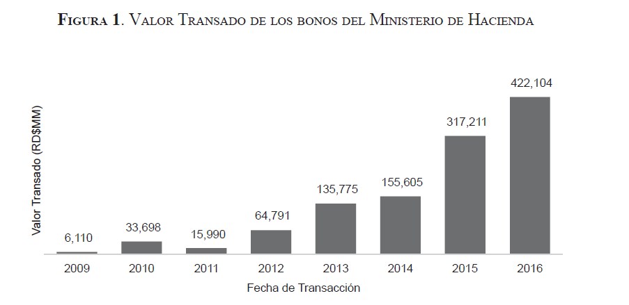 En la figura 1 se observa el volumen transado de los bonos del Ministerio de Hacienda en el mercado de bonos dominicano. Se percibe que ocurren dos períodos de alta aceleración del valor transado: 2012-2013 y 2014-2015.