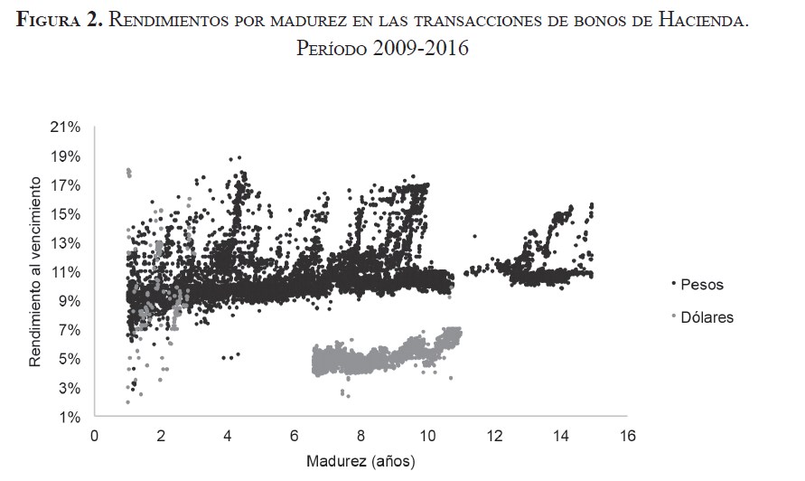 Notas. Esta figura muestra como un punto cada transacción de bonos del Ministerio de Hacienda en el año 2016, ubicándola según su madurez y rendimiento al vencimiento. La moneda en la que el bono está denominado se encuentra en la leyenda. Se filtraron las transacciones de bonos con madurez menor a un año debido a que ciertos tipos de operaciones de corto plazo en el mercado ocurren a precios (y por tanto rendimientos) que, primero, no son representativos del mercado, y segundo, se encuentran por fuera del comportamiento normal del mismo.