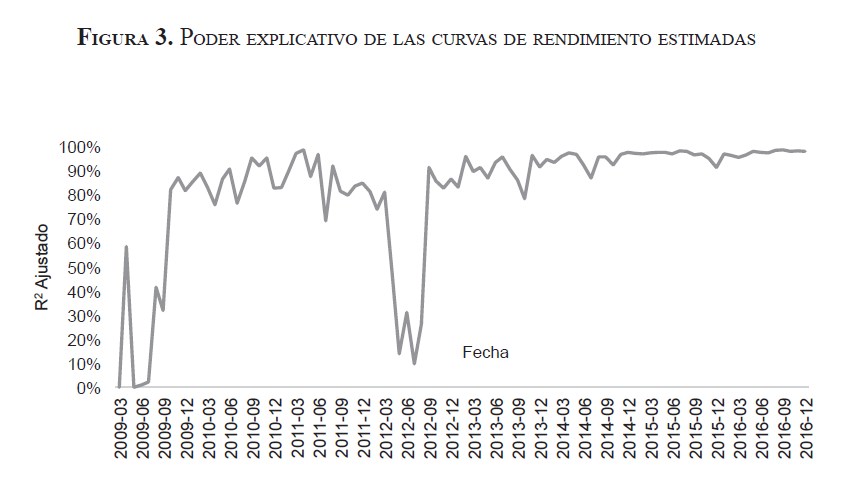 Con este modelo se estimó de forma individual la estructura de la curva de rendimiento del mercado de bonos del Ministerio de Hacienda para todos los meses (observaciones) en la muestra (94), de los cuales en 52 casos consecutivos (septiembre 2012 en adelante) fue posible identificar exitosamente los parámetros de la ecuación descrita con un coeficiente de poder explicativo (R2 ajustado) suficientemente alto (mayor a 80%). Esto se confirma en la figura debajo, que muestra el resultado de este coeficiente para todas las fechas de estimación.