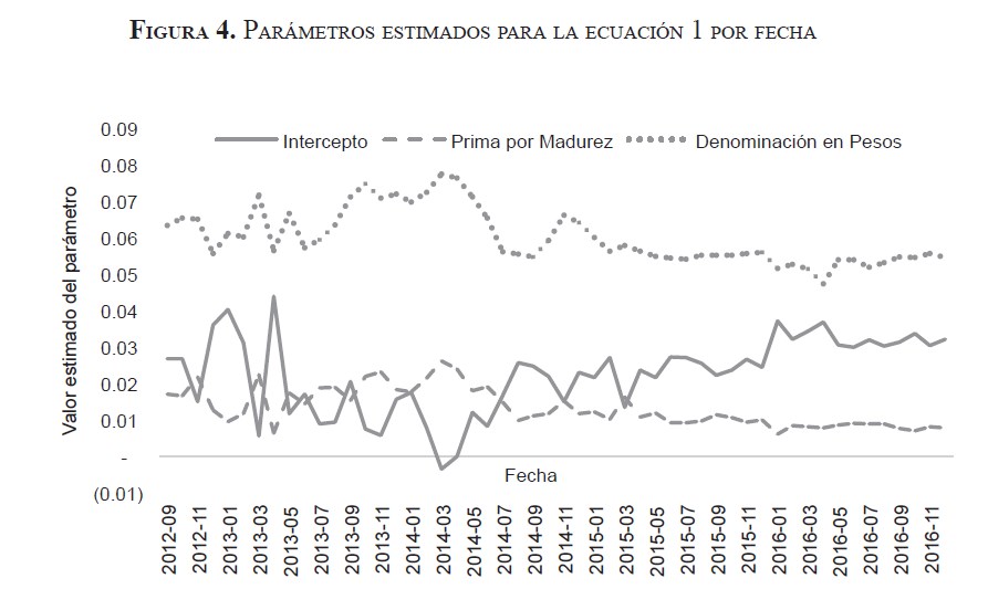 Notas. Esta figura muestra la evolución del valor estimado para los parámetros de la ecuación 1 sobre cada mes entre septiembre 2012 y diciembre 2016. El intercepto corresponde al parámetro, la denominación en pesos al parámetro, y la prima por madurez al parámetro.