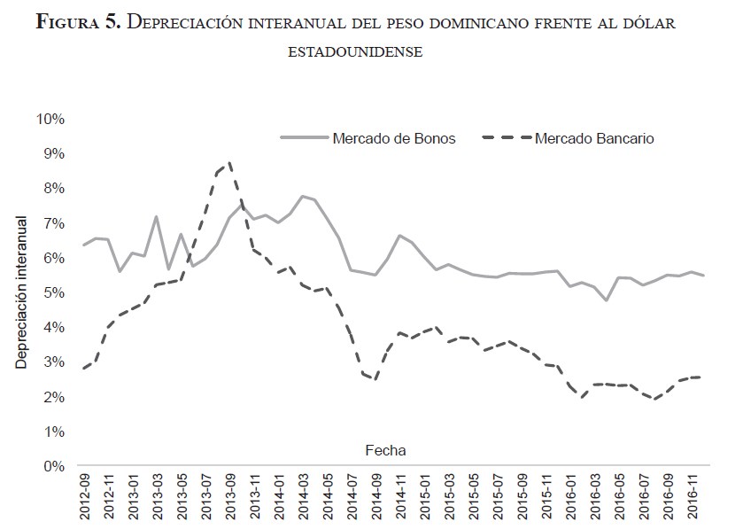 En la figura 4, se nota debajo que la depreciación implícita en el mercado de bonos se ha mantenido por encima y con mayor estabilidad que la depreciación del tipo de cambio peso/dólar en el mercado bancario (excluyendo el período junio-octubre de 2013). Esto sugiere que, a pesar del movimiento efectivo del tipo de cambio reflejado en las transacciones del mercado bancario, los inversionistas en el mercado de capitales mantienen expectativas de depreciación relativamente ancladas.