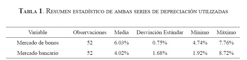 En la tabla 1 (debajo) se verifica que la depreciación implícita en el mercado de bonos mantiene a la vez una media por encima de la del mercado bancario, pero una volatilidad significativamente menor, lo que también se muestra a través del hecho de que los valores mínimos y máximos de la asociada al mercado bancario son más extremos que los asociados al mercado de bonos.