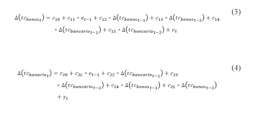 Luego, se extrajo el residuo (error de estimación = et ) de la ecuación anterior, que se consideraría el desequilibrio de largo plazo, y se introdujo en dos ecuaciones en diferencias de corto plazo con la siguiente forma funcional: