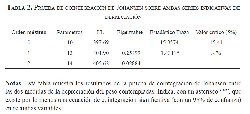 La ecuación 2 sugiere una relación de largo plazo entre la depreciación implícita en el mercado de bonos y la depreciación reflejada en el mercado bancario; en la medida que ambos mercados sean eficientes esta relación debe ser significativa. El parámetro asociado a la constante en el modelo (b0) explica cuánto por encima (o debajo) de la depreciación en el mercado bancario se ubica, en promedio, la depreciación explícita en el mercado de bonos; debido a los resultados de la tabla 1, se espera que el signo de este parámetro sea positivo. El segundo estimador (b1) explica cuánto aumenta la depreciación implícita en el mercado de bonos por cada punto porcentual que aumente la del mercado bancario, en el largo plazo.