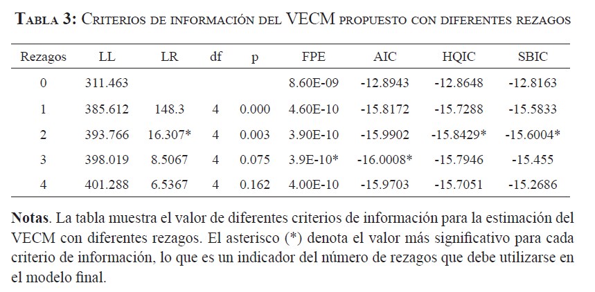 Luego, es necesario encontrar la cantidad de rezagos de las variables que es propicio incluir en el modelo estimado. A través de diferentes criterios de información se identifica que el VECM debe ser estimado con dos o tres rezagos de las variables explicativas. Se eligió una estimación con tres rezagos debido a que resultados de investigaciones econométricas como la realizada por Gonzalo (1994) indican que existe un riesgo significativo de sub-especificar el número de residuos en un VECM, lo que conduce a la presencia de correlación serial.