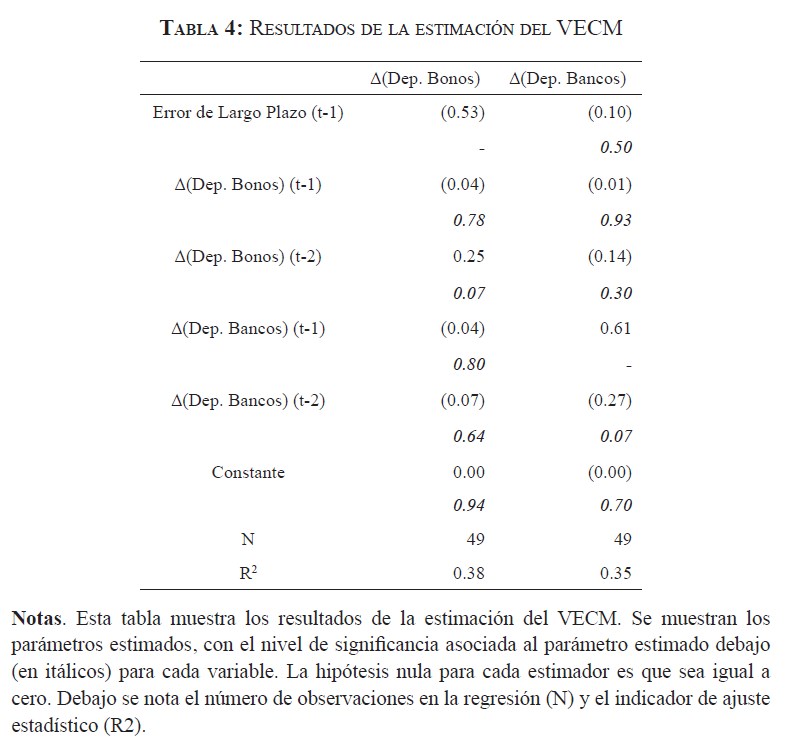 Al estimar el VECM, los resultados de la tabla 4 (debajo) señalan que es la depreciación implícita en el mercado de bonos que se corrige a la del mercado bancario; esto se verifica en el coeficiente atado a la variable “Error de Largo Plazo (t-1)”, que es el residuo de la ecuación de largo plazo rezagado un período, y la magnitud del mismo explica que los desequilibrios de largo plazo se corrigen aproximadamente en dos meses (1/0.53 = 1.9). Esta corrección es significativa con un 99% de confianza, rechazando la hipótesis nula de que el parámetro sea estadísticamente igual a cero. En el caso del mercado bancario, se nota que el coeficiente de corrección de error no es estadísticamente diferente de cero, indicando que es el mercado de bonos que se corrige a los movimientos del tipo de cambio en el mercado bancario. La velocidad de corrección, alrededor de dos meses, abre espacio para oportunidades de arbitraje por parte de los agentes económicos; en la medida que esta brecha sea aprovechada, se espera que la velocidad aumente (duración disminuya) hasta un nivel operacionalmente mínimo.