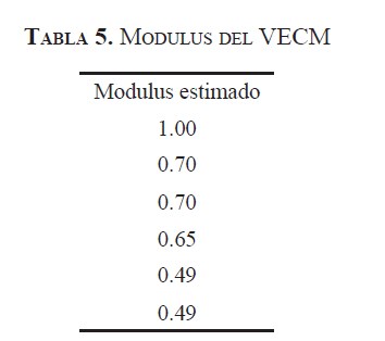 Notas. Modulus estimados del VECM, que confirman la condición de estabilidad de los valores propios del VECM. Esta condición se cumple en la medida que los valores en la tabla no superen la unidad.
