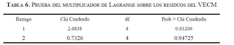 Notas. Esta tabla muestra los resultados de la prueba del multiplicador de Lagrage sobre los residuos del VECM estimado, notándose que no se rechaza la hipótesis nula de no correlación serial en los residuos.