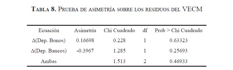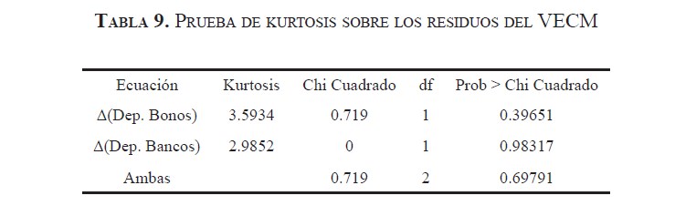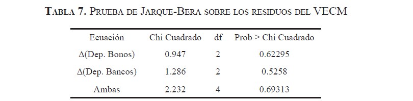 Como forma de verificar la validez de los resultados, se obtuvieron los valores propios asociados a la estabilidad del VECM (tabla 5), que se mantuvieron dentro de los límites de lo necesario para que el modelo tenga estabilidad dinámica. También, se realizó una prueba del multiplicador de Lagrange (tabla 6), a través de la cual no fue posible rechazar la hipótesis nula de no correlación serial de los residuos. Finalmente, se comprobó que no se rechaza la hipótesis nula de que los residuos tienen una distribución normal a través de pruebas de Jarque-Bera, asimetría y kurtoris (tablas 7-9).