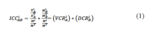 El Índice de Complementariedad Comercial (ICC) mide la relación entre la oferta exportadora de un país y la demanda importadora de su contraparte. El índice fue propuesto por Anderson & Norheim (1993) y se deriva del “índice de ventaja comparativa revelada” desarrollado por Balassa (1965). El ICC UE-Paraguay midió la relación entre la oferta exportadora del primero con el segundo. La probabilidad de que el comercio entre dos partes se concrete depende en gran medida en que la UE venda lo que Paraguay compre y a la inversa; o sea, que exista una complementariedad comercial entre ellos. La fórmula es la siguiente: