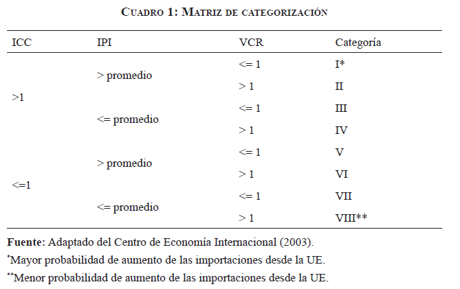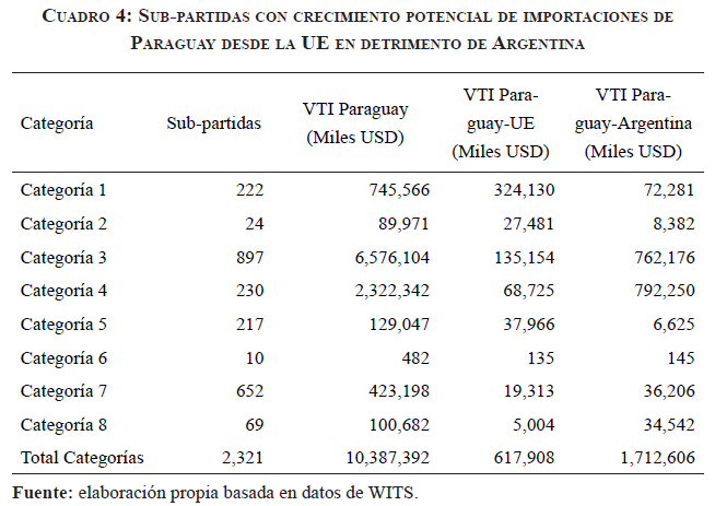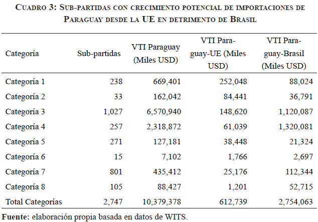 Los productos agrupados en la categoría I son aquellas sub-partidas: (i) con ICC UE-Paraguay superior a la unidad, indicando coincidencia entre la oferta exportadora del primero con la demanda exportadora del segundo, (ii) con alto nivel de intercambio comercial entre las partes, demostrado por el IPI superior al promedio, iii) en las cuales los proveedores del Paraguay registran una ventaja comparativa revelada, excluidas las exportaciones al Paraguay, igual o inferior a la unidad. En tanto que la menor amenaza la tienen los bienes de la categoría VIII, cuyo ICC es menor o igual a la unidad, demostrando la ausencia de complementariedad entre lo que uno vende y lo que el otro compra; el intercambio comercial entre ambas partes es bajo, o sea IPI menor o igual al promedio, y finalmente la VCR de los tres principales mercados para los bienes de la categoría es superior a la unidad, incluso cuando se excluyen las exportaciones a Paraguay de sus ventas externas totales.