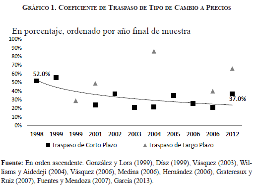 Los efectos que tiene la depreciación cambiaria sobre el nivel de precios de la economía dependen de lo que se conoce como el coeficiente de traspaso del tipo de cambio o coeficiente de Pass-Through; es decir, la magnitud en que varía el nivel de precios ante una variación del tipo de cambio, ya sea el nivel de precios de bienes importados o el nivel general de precios. La importancia de esta medición radica en que, dependiendo de la magnitud del efecto traspaso, la autoridad monetaria puede o no considerar el tipo de cambio dentro de su función de política. En adición, con la incorporación de un esquema de metas de inflación es de suponer que los agentes económicos anclen sus expectativas inflacionarias. Sin embargo, no existe consenso del efecto directo que puede tener un esquema de metas de inflación en el coeficiente de traspaso o de si un objetivo queda subordinado a otro –objetivo cambiario vs. objetivo inflacionario–1.