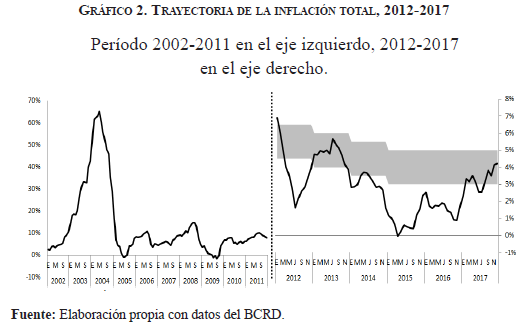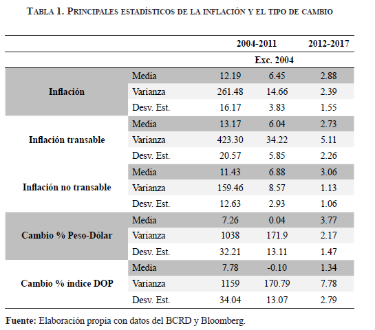 La tabla 1 presenta los principales estadísticos de la inflación y del tipo de cambio. Podemos observar un menor nivel y una menor volatilidad tanto en la inflación –total, transable y no transablecomo en el tipo de cambio –peso-dólar e índice DOPen los años posteriores a la introducción del esquema de metas de inflación en comparación con los años previos. Esta menor volatilidad no sólo se observa en términos absolutos, al apreciar la disminución de la desviación estándar en todas las variables para el período 2012-2017, sino también en términos relativos, si vemos estas desviaciones estándar como proporción de la media.
