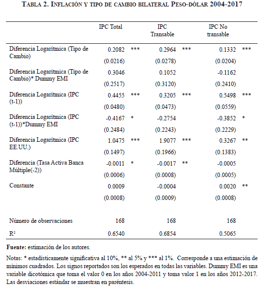 En esta ecuación, representa el índice de precios, representa el tipo de cambio nominal, las variables de control, el índice de precios de Estados Unidos, la variable dicotómica que toma el valor de 1 a partir del momento que se establece el esquema de metas de inflación y cero en el caso contrario8.