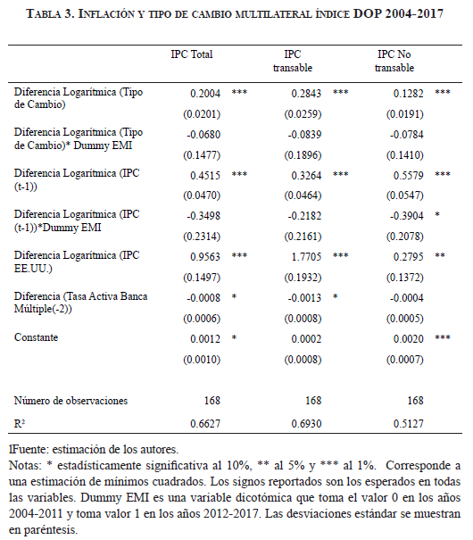 Para verificar lo anterior, en este trabajo se miden los efectos de la depreciación del tipo de cambio nominal al nivel de precios de los bienes transables (como proxy de los bienes importados), los bienes no transables y al nivel de precios general a través de la metodología de Mínimos Cuadrados Ordinarios (MCO). El análisis se enfoca en si ha habido cambios en estos efectos de la depreciación a partir de la adopción formal del esquema de metas de inflación por parte del Banco Central de la República Dominicana en enero del 2012.
