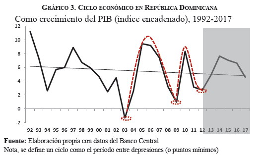 Otro aspecto a considerar es que, si bien la evaluación de una política monetaria es un asunto mucho más complicado que ver si se cumple el objetivo inflacionario o no (Svensson, 2009), la aplicación de la política monetaria se dificulta o facilita dependiendo de en qué fase del ciclo económico se encuentre la economía. El manejo, por parte de la autoridad monetaria para la consecución de sus metas, de la incertidumbre, euforia, auge del producto, mercado de crédito, entre otras variables, dependerá en gran manera de este ciclo económico; y, como podemos ver en el gráfico 3, los períodos estudiados no tienen los ciclos distribuidos de manera equitativa. Aunque la variable de tasa de interés controla por la política monetaria vigente, es destacable que en el período 2004-2011, se aprecian 2 ciclos económicos, con puntos de inflexión bien definidos, mientras que en el período 2012-2017 todavía no se aprecia un ciclo económico completo, pues el año 2017 no representa un año de inflexión. Este aspecto se debe tomar en consideración al interpretar los resultados de este estudio, pues es difícil evaluar una política que ayuda a suavizar el ciclo económico si este último no se ha completado.