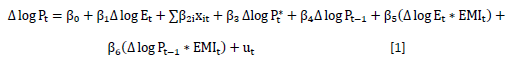 El modelo empelado está basado en la metodología de Edwards (2006) y se centra en la especificación tradicional de estimar el efecto traspaso en adición a dos variables interactivas que pretenden evaluar el efecto de la adopción de esquemas de metas inflacionarias, de acuerdo a la ecuación [1]: