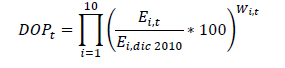 El DOP es un índice Paasche, con base diciembre 2010 igual a 100. La ponderación es geométrica, tomando la proporción del comercio (exportaciones más importaciones) con dicho país el año anterior. Matemáticamente se puede expresar de la siguiente manera: