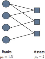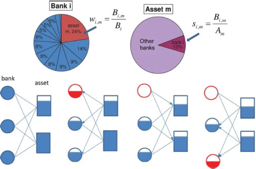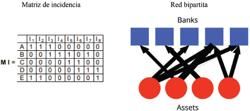 Caccioli et al. (2014), consideran que las tenencias de activos comunes han sido el principal vector de contagio en la crisis financiera de 2008. La representación de un sistema financiero está dada en términos de una red de N bancos y M activos. En su estudio, asumen que cada vez que un banco invierte en un activo, se traza un enlace en la red que conecta ese banco con ese activo. La red resultante es bipartita (figura 2), lo que significa que hay dos grupos de nodos (bancos y activos) y que solo hay enlaces entre estos dos grupos.