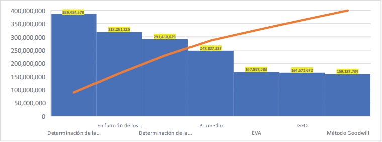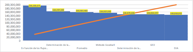 Los demás métodos (Goodwill, EVA, GEO) muestran resultados entre 159 millones y 167 millones, esto al sustentar los flujos futuros en la utilidad neta y el rendimiento de los activos. Estos métodos son más conservadores en términos del valor resultante de los cálculos.