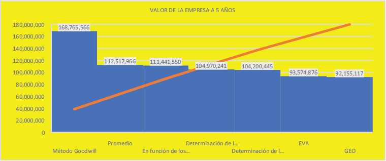 En términos promedio los cálculos del precio de la empresa con horizonte a 5 años, el valor promedio de los valores calculados en cada método asciende a 158.50 millones de pesos. Los resultados van desde 143.8 millones a 195.2 millones (ver Gráfico 1).