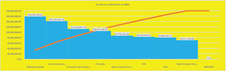 En tanto, en términos promedio el valor de la empresa a 10 años es de 247.83 millones de pesos, lo que se explica por el flujo positivo de la empresa de todos los métodos empleados (ver Gráfico 2).