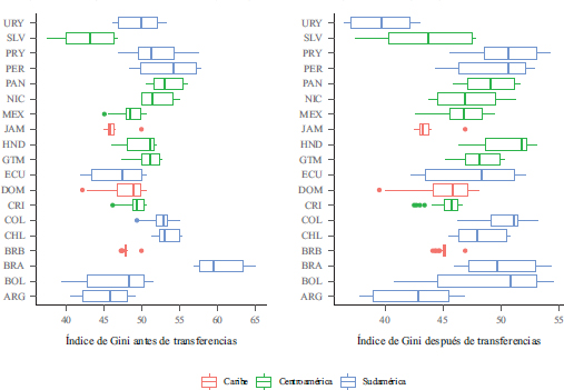 Gráfico de caja de Gini antes y después de transferencias por país, 1995-2018
