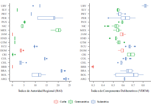 El gráfico 2 presenta una comparación entre el Índice de Autoridad Regional (RAI) y el Índice de Componentes Deliberativos. A la izquierda, el RAI muestra que los países de Sudamérica, como Brasil y Argentina, tienen mayores niveles de descentralización y poder en los gobiernos regionales. En contraste, los países del Caribe tienen un bajo nivel de autonomía regional. A la derecha, el Índice de Componentes Deliberativos mide la calidad de los procesos democráticos en los países. Vemos que países como Uruguay, Argentina y Costa Rica se destacan con valores altos, lo que indica un fuerte componente deliberativo en sus democracias, mientras que países centroamericanos tienen menor calidad deliberativa.