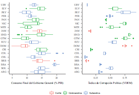 Consumo final del gobierno general e índice de corrupción política por país, 1995-2018