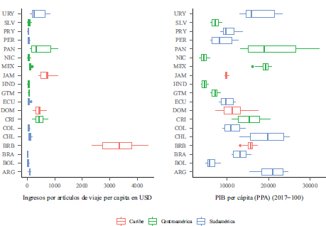 Por otro lado, el gráfico 4 ilustra del lado izquierdo los Ingresos por artículos de viaje per cápita. Barbados y Brasil destacan por los altos ingresos turísticos, mientras que otros países, especialmente en Centroamérica, presentan menores ingresos per cápita. A la derecha, el PIB per cápita ajustado por PPA refleja el nivel de desarrollo económico, donde Argentina, Panamá, Uruguay y Chile muestran valores más altos, en comparación con países como Nicaragua y Honduras, que tienen un PIB per cápita significativamente más bajo.