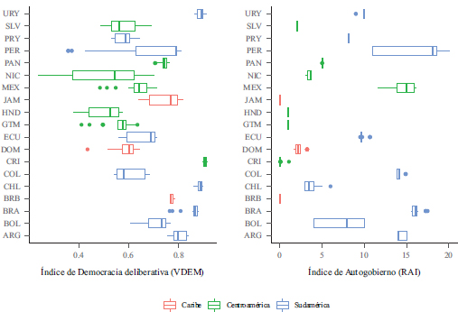 Índice de democracia deliberativa (poliarquía) e índice de Autogobierno por país, 1995-2018