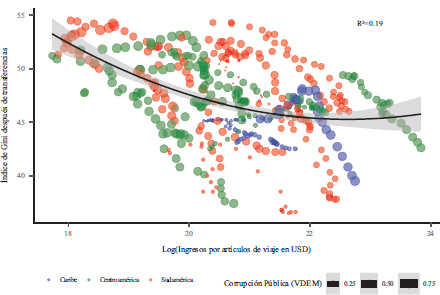 En el gráfico 7 relación negativa entre los ingresos por turismo y la desigualdad (medida por el Índice de Gini post transferencias) en países de América Latina y el Caribe. A medida que los ingresos por turismo aumentan, la desigualdad tiende a disminuir, especialmente en Sudamérica y Centroamérica. Sin embargo, en países con altos niveles de corrupción, este efecto es menos evidente. El nivel de corrupción modera el impacto positivo del turismo en la reducción de la desigualdad. La relación observada es moderada, con una R² de 0.19, indicando que otras variables también influyen en la desigualdad.