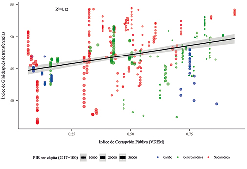 Este gráfico presenta la relación entre el Índice de Corrupción Política (VDEM) en el eje horizontal y el Índice de Gini después de transferencias (que mide la desigualdad) en el eje vertical. Se muestra una tendencia positiva moderada (R² = 0.13), lo que sugiere que, a mayor corrupción política, aumenta la desigualdad. Los puntos están codificados por región (Caribe, Centroamérica, Sudamérica) y el grosor de los bordes de los puntos indica el Índice de Democracia Electoral. Regiones como Sudamérica muestran mayor variabilidad en corrupción y desigualdad.