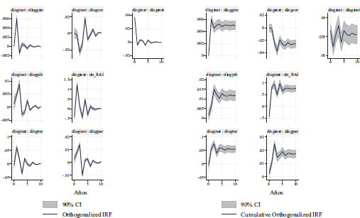 Después de realizar estadísticos de diagnóstico del modelo (causalidad de Granger y estabilidad del VAR de panel)4, Se utilizó un total de 1000 simulaciones de Monte Carlo para estimar los errores estándares de las funciones impulso-respuestas ortogonalizadas en base a la secuencia recursiva explicada en la tabla 2. También las pruebas de estabilidad del VAR y de Causalidad de Granger fueron efectuadas y en el caso de la primera, el VAR posee estabilidad5.