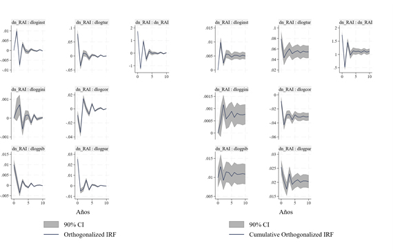 En términos generales, el shock en dn_RAI tiene un efecto notable sobre la corrupción política (dlogcor), con una caída inicial que luego se estabiliza (gráfico 11). También se observa un impacto sobre el PIB per cápita (dlogpib), donde el efecto inicial es positivo y se mantiene moderado. La desigualdad (dloggini) tiene una respuesta más fluctuante, pero se estabiliza a largo plazo, en términos acumulados es positiva. Los impactos sobre el turismo (dlogtur) y la participación política (dlogpar) muestran fluctuaciones en el corto plazo, pero se estabilizan en el mediano y largo plazo, siendo en ambos un impacto negativo.
