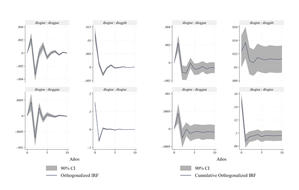 El gráfico 12 de impulso-respuesta (IRF) y la IRF acumulada de un shock en turismo (dlogtur) muestra que, inicialmente, el turismo tiene un impacto positivo contemporáneo (que aumenta en el 1er año) en el PIB per cápita (dlogpib), aunque se estabiliza hacia un efecto positivo en los años siguientes. En cuanto a la desigualdad (dloggini), el efecto contemporáneo es nulo y luego es positivo en el primer año, pero tiende a estabilizarse en un efecto nulo a lo largo del tiempo (efecto transitorio). La participación política (dlogpar) y el turismo (dlogtur) muestran una respuesta positiva en el primer año, que luego se reduce a partir del segundo y se mantiene estable en cero.