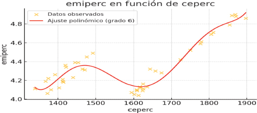 Un resultado muy importante de este estudio es que la relación empírica entre las emisiones per cápita (EmiPerc) y el ingreso per cápita (Y) estimada mediante una regresión polinómica de quinto grado presenta una forma en U invertida consistente con la hipótesis de la Curva Ambiental de Kuznets (CAK). El análisis muestra que las emisiones aumentan con el ingreso hasta un umbral de aproximadamente 7,500 dólares, luego disminuyen, pero experimentan un repunte leve al acercarse a los 9,800 dólares, seguido por una estabilización o ligera reducción. Este patrón sugiere que, si bien existe una tendencia a la desvinculación entre crecimiento económico e impacto ambiental, esta no es estrictamente lineal ni irreversible. Más bien, indica una posible doble fase o estructura ondulante, posiblemente influida por factores como el consumo creciente, las mejoras tecnológicas, o las políticas ambientales. Este resultado fortalece el uso de modelos de evaluación integrados y plantea la necesidad de políticas diferenciadas según el nivel de ingreso.