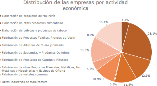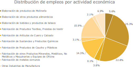 Por actividades productivas, el 25.1 % de las empresas produce alimentos, el 13.3 % fabrica productos minerales, metálicos y maquinaria, el 12.3 % elabora bebidas y tabaco, y el 11.8 % confecciona textiles y prendas de vestir (Gráfica 2). El 16.1 % restante opera en otras ramas manufactureras. Las 311 empresas encuestadas emplean 39,377 trabajadores, con 48.1 % en alimentos, bebidas y tabaco, y 30.2 % en productos minerales, metálicos y químicos (Gráfica 3).