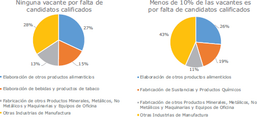 Las tablas A1 y A2 (apéndice) detallan las vacantes por falta de personal calificado. Entre las 198 empresas respondientes, 66 reportan vacantes por carencia de candidatos cualificados. Las industrias alimenticias representan el 23 % de estas vacantes, seguidas por empresas de productos químicos (18 %), textiles (12 %) y producción de minerales metálicos (12 %). La mayoría de las vacantes se ubica en el Distrito Nacional (32 %), Gran Santo Domingo (29 %) y Santiago (21 %). Notablemente, ninguna de las 18 empresas en Duarte, La Vega, Peravia, San Pedro y Monte Plata reporta vacantes por esta causa.