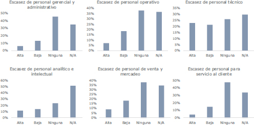 La encuesta también revela escasez de personal por categoría ocupacional (tablas A3-A8, apéndice). Solo el 9.5 % de las empresas reporta alta escasez de personal gerencial, mientras el 70 % indica no tener dificultades en esta categoría. En cambio, el 63 % señala escasez alta o moderada en posiciones técnicas y especializadas, y el 52 % reporta carencias significativas en analistas e ingenieros. Por el contrario, las posiciones de servicio al cliente, ventas y mercadeo no muestran escasez importante, con la mayoría indicando no tener dificultades para cubrirlas.
