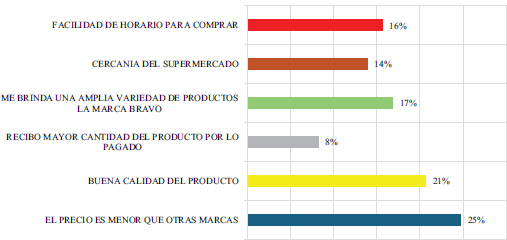 Adicionalmente, el 17% de los encuestados indicó que la variedad de productos ofertados bajo la marca privada Bravo es uno de sus motivos para comprarla. A la medida que esta marca se extiende a varias categorías de productos el impacto visual en las góndolas de las tiendas de la Cadena de Supermercados Bravos es mayor, por lo que permite reforzar la recordación de marca de esta.