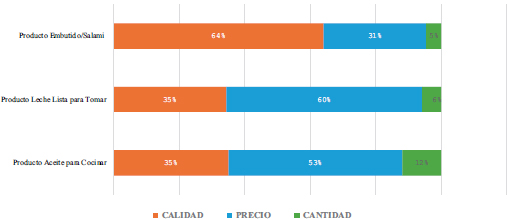 En el caso de la categoría de producto embutido/salami, el 64% de los encuestados considera la calidad como el principal factor que los motiva a cambiar de la marca del fabricante hacia la marca privada Bravo. Le siguen el precio, con un 31%, y la cantidad, con un 5%.