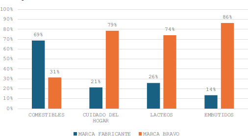 En el caso de los Lácteos, las marcas del fabricante registraron un 26% de participación, mientras que la marca Bravo alcanzó un 74%.